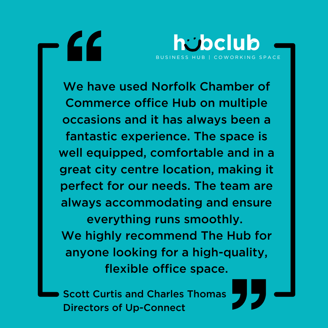 If you are a member of the Norfolk Chambers of Commerce then you are entitled to a 50% discount on Hub usage. Please email hello@norfolkchambers.co.uk if you’d like to discuss joining as a member.